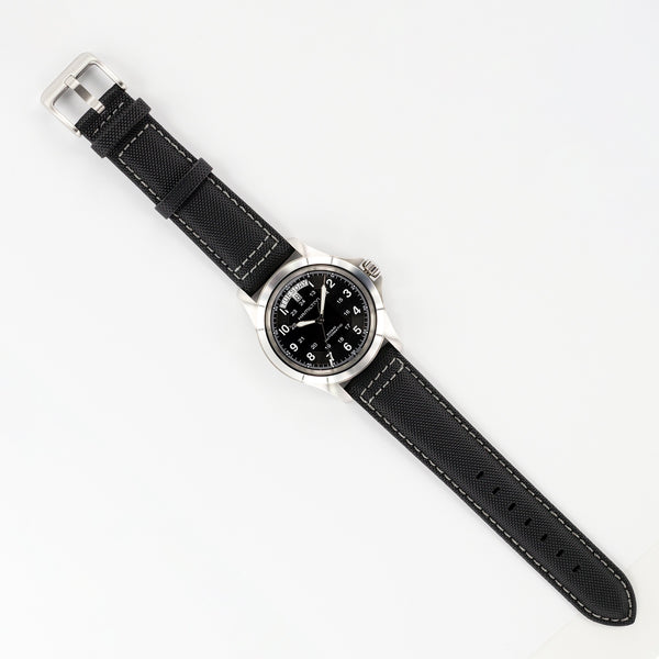 Great look and feel, the sailcloth material has a nice sheen to it and the grey stitching gives has just enough contrast to make it more interesting, almost metallic. Looks fantastic on my Hamilton Khaki Field Auto! Quite soft and comfortable straight out of the package. Very satisfied!